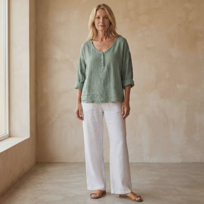 Anaria - Stylish Linen Shirt features a relaxed silhouette with a soft scoop neckline and a neat button placket that adds subtle structure. The gently rolled sleeves and loose drape create an easy, natural flow that feels effortless on the body. Its clean, minimal look makes it simple to style with light trousers or casual bottoms for a refined everyday outfit.