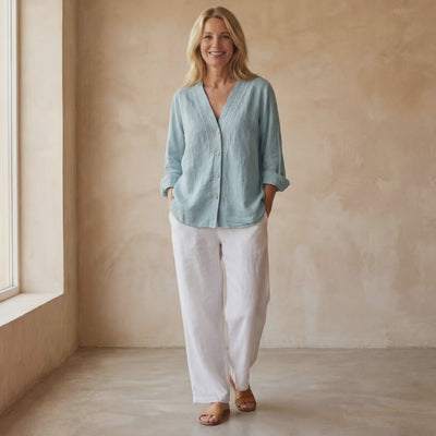 The Aradana Bohemian Linen Shirt features a breathable linen fabric with a soft V-neckline, button front, and delicate trim detailing for a relaxed, artisanal look. Designed with long sleeves and a naturally draped silhouette, it offers a light, airy feel with understated character. A timeless piece that pairs beautifully with neutral trousers or layered styling.