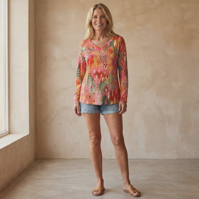 The Arela Bohemian Top features a vibrant multicolor print with a flattering V-neckline and long sleeves for a relaxed, expressive look. Designed with a lightweight feel and soft drape, it sits comfortably on the body and pairs easily with denim or casual shorts. A standout piece ideal for everyday wear, warm days, or effortless boho styling.