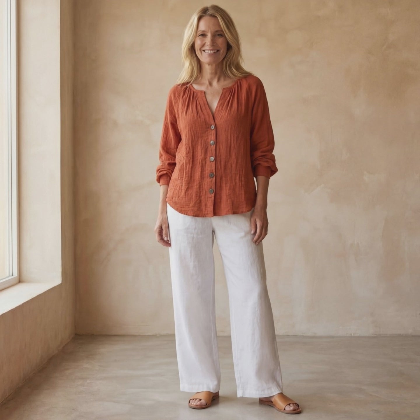 ARINA – Bohemian Vintage Shirt features a warm rust hue with a softly smooth texture and a relaxed button-front silhouette. Finished with a gentle V neckline and rolled sleeves, it brings a natural, lived-in character with subtle vintage appeal. An easy statement piece that pairs beautifully with light linens, denim, or layered looks, ideal for relaxed days and effortless styling.