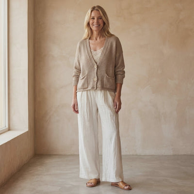 Aronda - Bohemian Cardigan brings an easy, relaxed layer with a softly draped silhouette and a clean open-front look. Designed with a gentle V neckline, subtle button closure, and practical front pockets, it adds effortless warmth without feeling heavy. The slightly cropped length pairs naturally with high-waisted trousers or flowing bottoms for a balanced, everyday style.