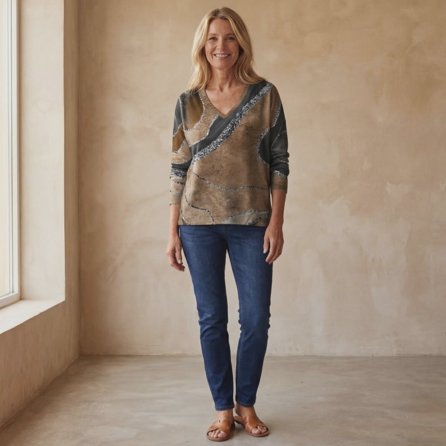 CAROLIA Colorful Tee features a relaxed V-neck silhouette with an abstract, image-inspired print that adds depth and visual interest to the overall look. The long sleeves and soft drape create an easy, flattering fit that feels comfortable while still looking thoughtfully styled. Designed to pair effortlessly with denim or casual bottoms, this tee brings a creative touch to everyday outfits without feeling overstated.