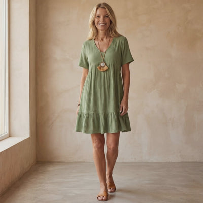 Danae Stylish Boho Dress features a softly draped silhouette with a flattering V-neckline and a gently gathered waist that creates natural movement. The short sleeves and flowing skirt offer an easy, relaxed shape, while the lightly textured finish adds visual interest throughout. A versatile piece that feels airy and graceful, perfect for relaxed days or casual gatherings.