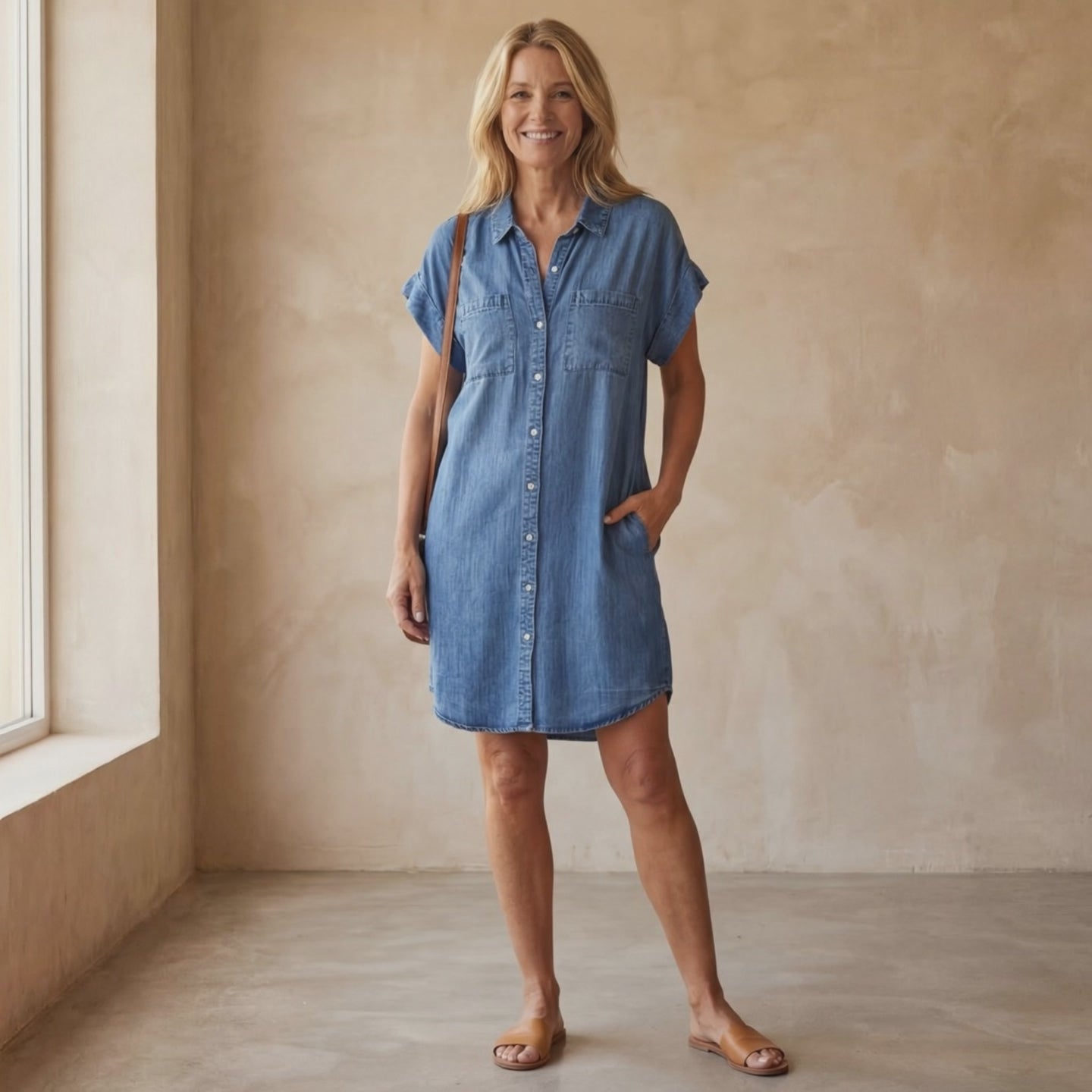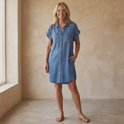 The Elenore Denim Dress features a softly washed blue denim with a clean button-front design and subtle chest pockets for a balanced, laid-back structure. Cut with short rolled sleeves and a straight silhouette, it offers an easy drape that feels relaxed yet thoughtfully shaped. Finished with side pockets and a gently curved hem, this dress brings timeless simplicity with modern appeal.