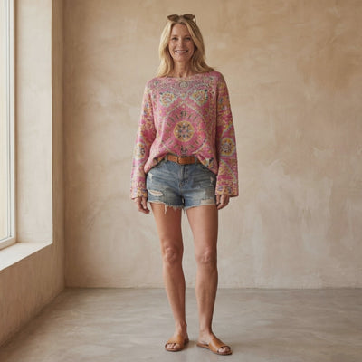 The Fariasa – Floral Boho Sweater features a vibrant all-over floral pattern with a relaxed silhouette that feels expressive yet easy to wear. Shown with a soft round neckline, gently dropped shoulders, and full-length sleeves, it creates a naturally laid-back look with visual texture. The rich boho tones gives the sweater a handcrafted, artistic feel that stands out without overpowering.