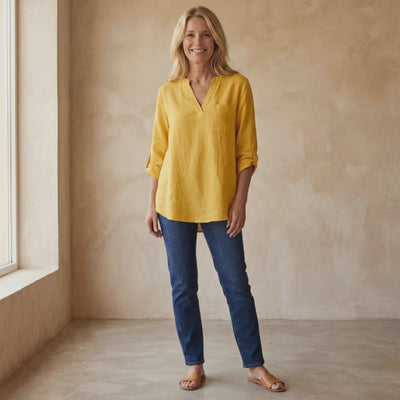 ILIDANA Elegant Vintage Top highlights a softly tailored silhouette with a graceful V-shaped neckline that adds subtle character to the overall look. The lightly textured fabric, rollable sleeves, and curved hem create a relaxed yet refined appearance. Offered in rich, timeless tones, ILIDANA pairs effortlessly with slim trousers or denim for an understated, classic finish.